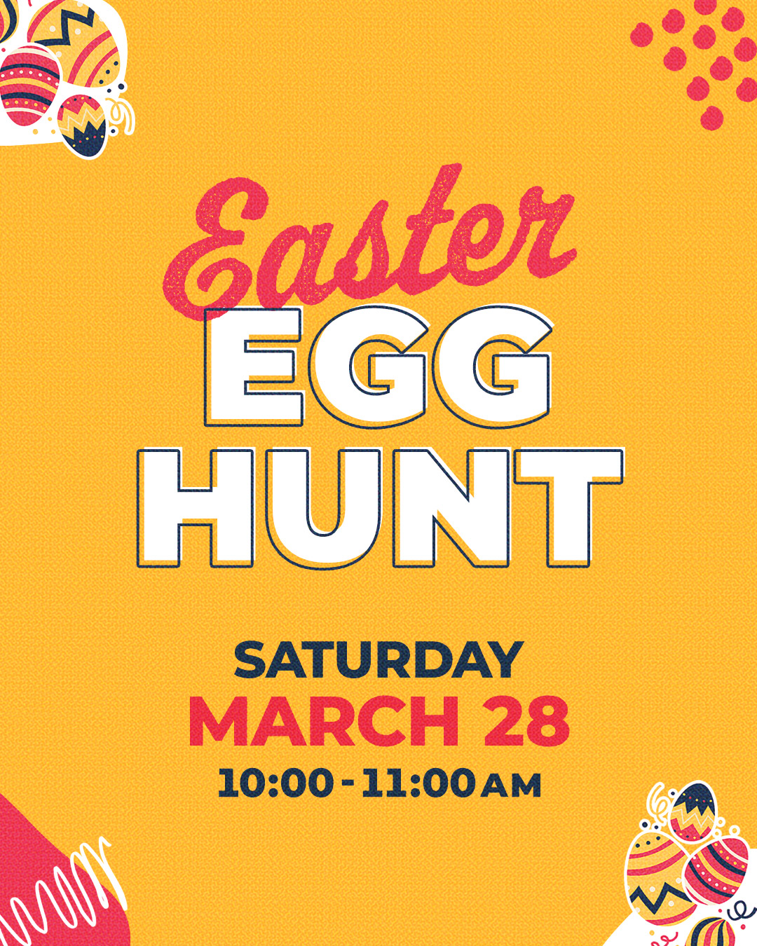 Come enjoy some family fun at our annual Easter Egg Hunt! We’ll start with games, crafts and treats in the gym, and finish with the egg hunt! We can’t wait to welcome you and your family!