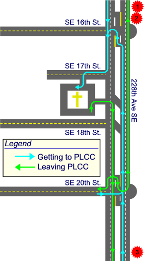 - Take a right turn (to the south) when exiting the lot. 228th Ave does not allow for a left turn exit. You can take a U-turn at the next light to head back to the north (see map).